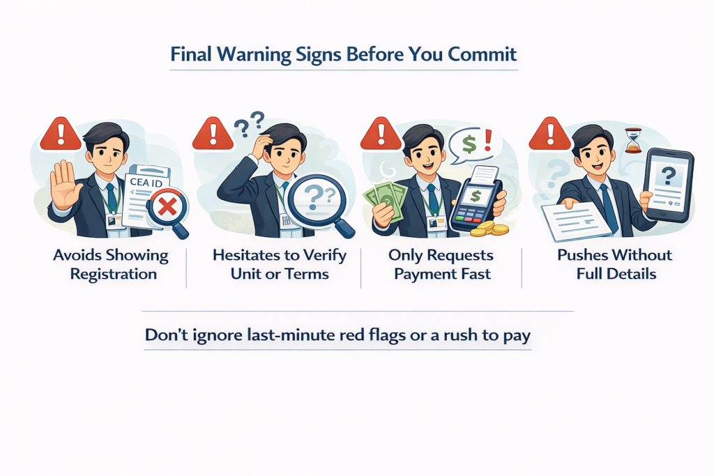 The best starting point is the CEA Public Register. There, you can check the agent’s name, registration status, and other basic details. It also helps to compare that information with the phone number, agency name, and profile you were given. If details do not match, that should raise concern immediately. You should also be careful if the person avoids direct answers, rushes you toward a deposit, or does not explain the process clearly. The next part looks at the most common warning signs people should notice before moving ahead with a property agent in Singapore.