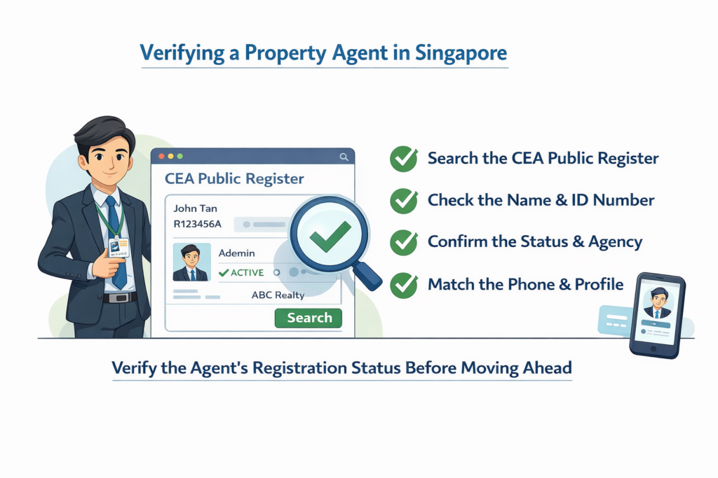 Start with the CEA Public Register. Check the agent’s name, registration status, and agency details, then compare them with the profile, phone number, and listing information you were given.