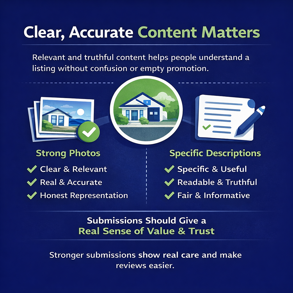 Every submission should be supported by content that helps users understand the listing or profile more clearly. This includes both written information and visual material. Images should be relevant, clear, and representative of the actual property, building, business, or service being presented. Low-quality, misleading, overly edited, or unrelated visuals can weaken trust and make the submission harder to assess fairly. The same applies to written content. Descriptions should be specific, readable, and useful instead of vague, repetitive, or purely promotional. Users should be able to understand what is being offered, who it is for, and what makes it worth considering. Profiles should also reflect the real identity and purpose of the listing, agency, or agent behind the submission. Strong content standards help us review pages more effectively, but they also help submissions perform better as published pages by making them more informative, more credible, and more useful in search-driven discovery.